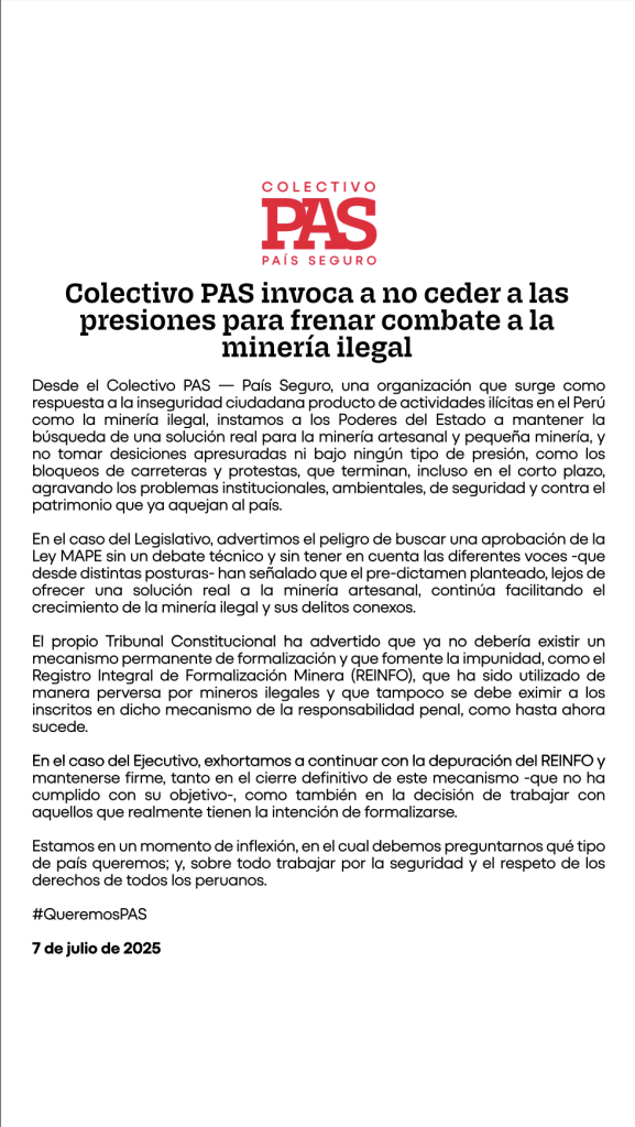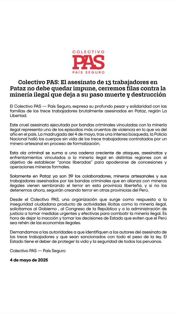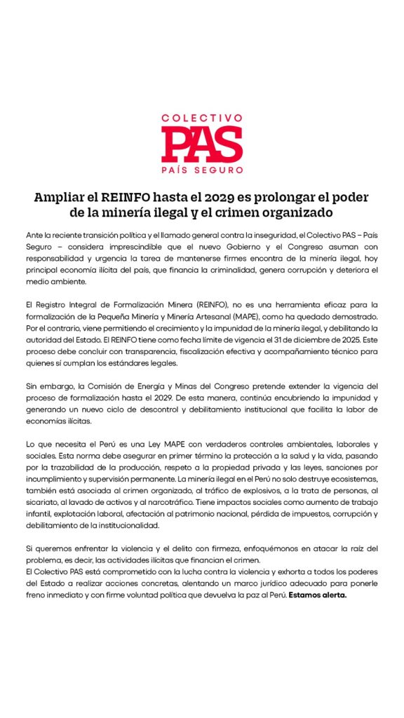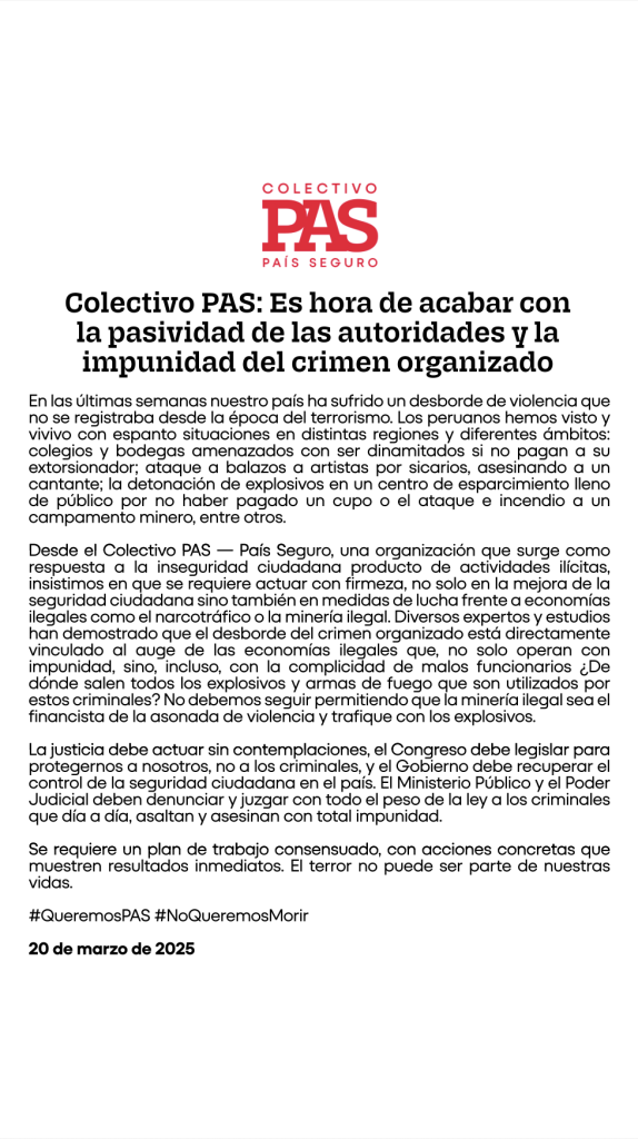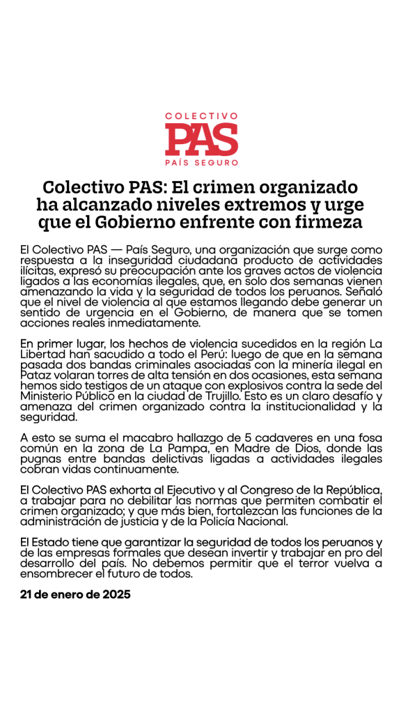 Al suscribir el presente documento otorgo mi consentimiento libre, previo, informado, expreso e inequívoco al Colectivo País Seguro (en adelante COLECTIVO PAS), para el tratamiento de mis datos personales, para los fines pertinentes. Asimismo, autorizo al COLECTIVO PAS incluir en sus sistemas y base de datos mis datos personales, teniendo conocimiento que el COLECTIVO PAS asegura la confidencialidad de estos y garantiza que no los compartirá con personas ajenas.